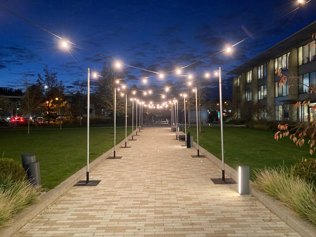Outdoor spaces can be highlighted with our IP Rated led washes for large trees, architectural structures such as venue entrances or archways. Pathways and car park lighting for a safety aspect is also important to think about when planning and this is where our tall shepherd hook with festoon light strings and flood lighting can be useful.
